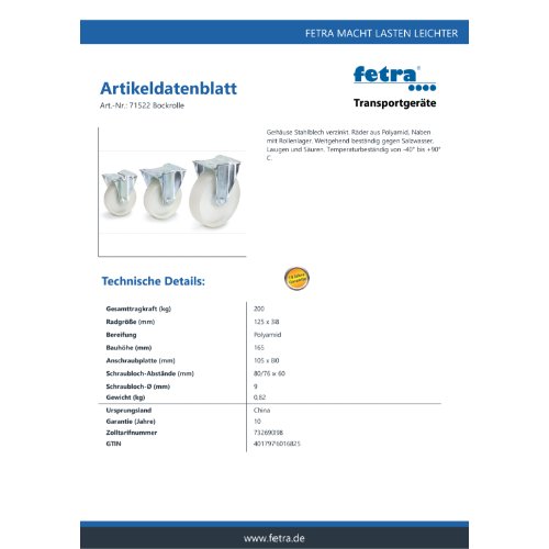 Eigenschaften "FETRA Bockrolle 125 x 38 mm, 71522"
