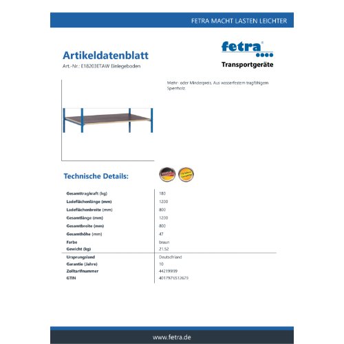 Eigenschaften "FETRA Boden für Etagenwagen 1200 x 800 - Zubehör -, E18203ETAW"