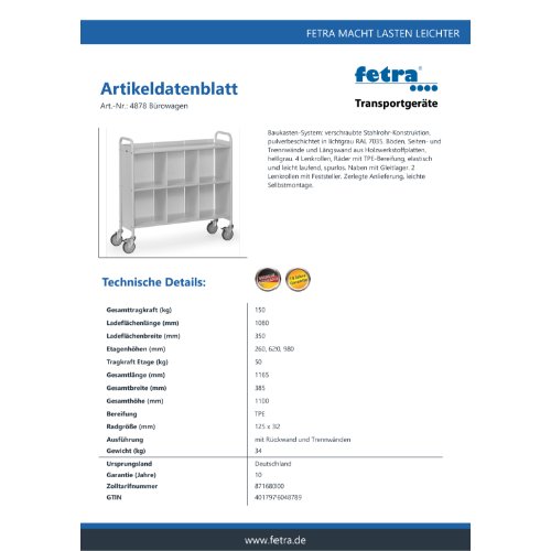 Baukasten-System: verschraubte Stahlrohr-Konstruktion, pulverbeschichtet in lichtgrau RAL 7035. Böden, Seiten- und Trennwände und Längswand aus Holzwerkstoffplatten, hellgrau. 4 Lenkrollen, Räder mit TPE-Bereifung, elastisch und leicht laufend, spurlos. Naben mit Gleitlager. 2 Lenkrollen mit Feststeller. Zerlegte Anlieferung, leichte Selbstmontage.