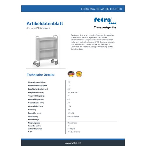 Baukasten-System: verschraubte Stahlrohr-Konstruktion, pulverbeschichtet in lichtgrau RAL 7035. Böden, Seitenwände und Längswand aus Holzwerkstoffplatten, hellgrau. 4 Lenkrollen, Räder mit TPE-Bereifung, elastisch und leicht laufend, spurlos. Naben mit Gleitlager. 2 Lenkrollen mit Feststeller. Zerlegte Anlieferung, leichte Selbstmontage.