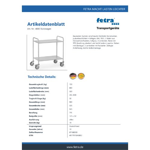 Baukasten-System: verschraubte Stahlrohr-Konstruktion, pulverbeschichtet in lichtgrau RAL 7035. 2 Böden aus Holzwerkstoffplatten, hellgrau. 4 Lenkrollen, Räder mit TPE-Bereifung, elastisch und leicht laufend, spurlos. Naben mit Gleitlager. 2 Lenkrollen mit Feststeller. Zerlegte Anlieferung, leichte Selbstmontage.