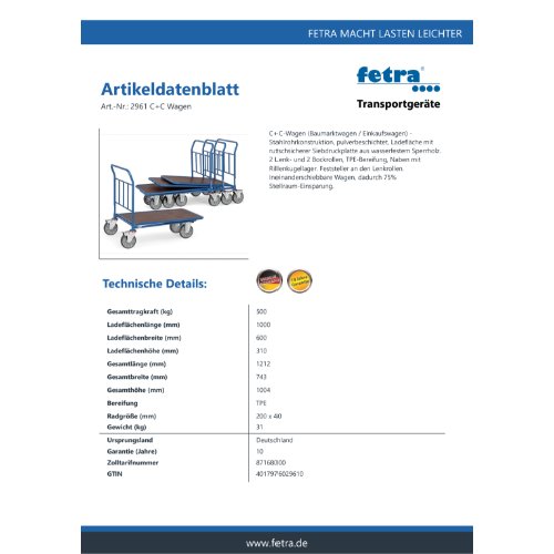 C+C-Wagen (Baumarktwagen / Einkaufswagen) - Stahlrohrkonstruktion, pulverbeschichtet, Ladefläche mit rutschsicherer Siebdruckplatte aus wasserfestem Sperrholz. 2 Lenk- und 2 Bockrollen, TPE-Bereifung, Naben mit Rillenkugellager. Feststeller an den Lenkrollen. Ineinanderschiebbare Wagen, dadurch 75% Stellraum-Einsparung.