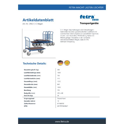 C+C-Wagen (Baumarktwagen oder Einkaufswagen) - Stahlrohrkonstruktion, pulverbeschichtet, Ladefläche mit rutschsicherer Siebdruckplatte aus wasserfestem Sperrholz. 2 Lenk- und 2 Bockrollen, TPE-Bereifung, Naben mit Rillenkugellager. Feststeller an den Lenkrollen. Ineinanderschiebbare Wagen, dadurch 75% Stellraum-Einsparung.