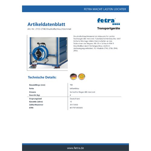 Eigenschaften "FETRA Druckluftschlauchtrommel - Zubehör -, 2153-2746"