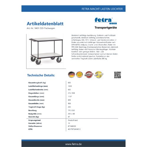 Eigenschaften "FETRA ESD-Tischwagen 9401"