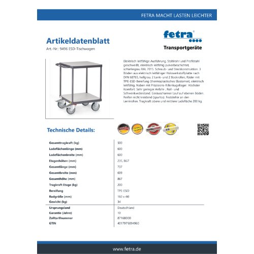 Eigenschaften "FETRA ESD-Tischwagen 9496"