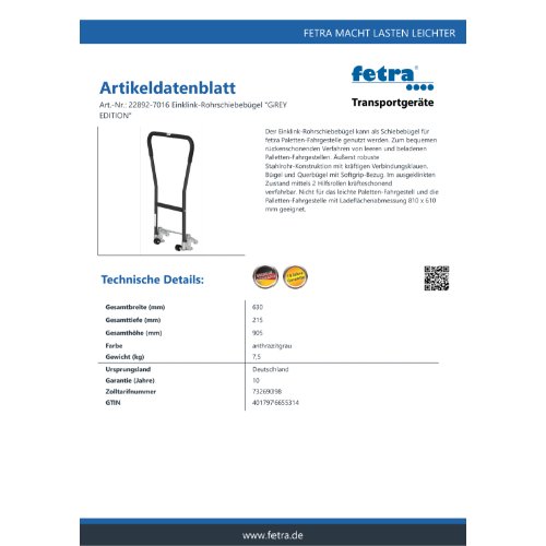 Der Einklink-Rohrschiebebügel kann als Schiebebügel für fetra Paletten-Fahrgestelle genutzt werden. Zum bequemen rückenschonenden Verfahren von leeren und beladenen Paletten-Fahrgestellen. Äußerst robuste Stahlrohr-Konstruktion mit kräftigen Verbindungsklauen. Bügel und Querbügel mit Softgrip-Bezug. Im ausgeklinkten Zustand mittels 2 Hilfsrollen kräfteschonend verfahrbar. Nicht für das leichte Paletten-Fahrgestell und die Paletten-Fahrgestelle mit Ladeflächenabmessung 810 x 610 mm geeignet.