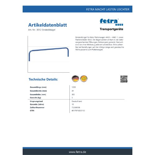 Einsteckbügel für fetra Plattenwagen 4463 + 4463-1, sowie Plattenständer 4363. Die Bügel werden einfach in die dafür vorgesehenden Öffnungen (Bohrungen) gesteckt. Dadurch sind sie ohne Werkzeug jederzeit umsteckbar. Bitte achten Sie bei Bestellungen auf die richtige Länge und gewünschte Höhe passend zum Plattenwagen.