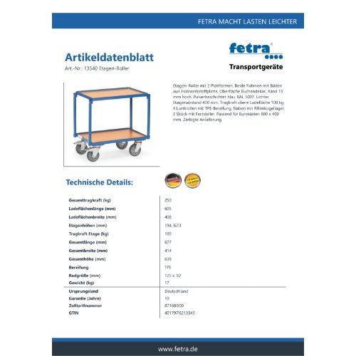 Eigenschaften "FETRA Etagenroller -2 Etagen mit Rand-, 13540"