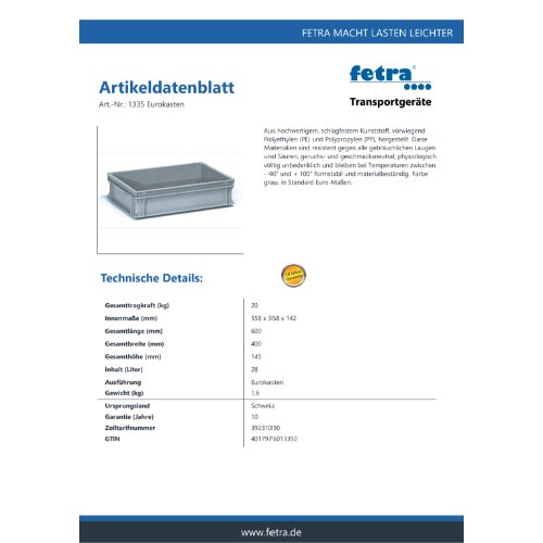 Eigenschaften "FETRA Eurokasten 600 x 400 x 145 mm, 1335"