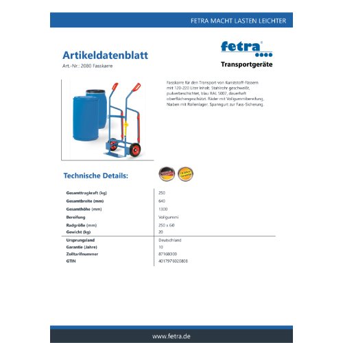 Fasskarre für den Transport von Kunststoff-Fässern mit 120-220 Liter Inhalt. Stahlrohr geschweißt, pulverbeschichtet, blau RAL 5007, dauerhaft oberflächengeschützt. Räder mit Vollgummibereifung, Naben mit Rollenlager. Spanngurt zur Fass-Sicherung.