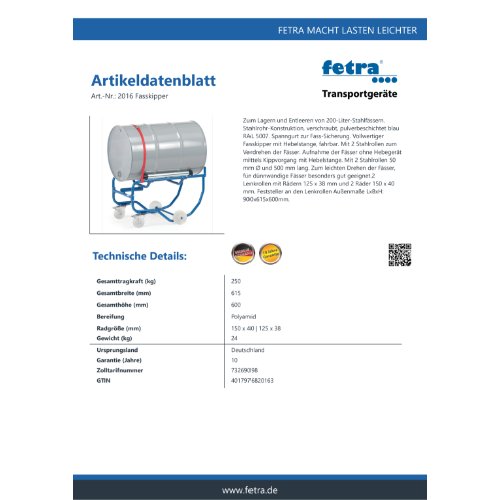 Zum Lagern und Entleeren von 200-Liter-Stahlfässern. Stahlrohr-Konstruktion, verschraubt, pulverbeschichtet blau RAL 5007. Spanngurt zur Fass-Sicherung. Vollwertiger Fasskipper mit Hebelstange, fahrbar. Mit 2 Stahlrollen zum Verdrehen der Fässer. Aufnahme der Fässer ohne Hebegerät mittels Kippvorgang mit Hebelstange. Mit 2 Stahlrollen 50 mm Ø und 500 mm lang. Zum leichten Drehen der Fässer, für dünnwandige Fässer besonders gut geeignet.2 Lenkrollen mit Rädern 125 x 38 mm und 2 Räder 150 x 40 mm. Feststeller an den Lenkrollen Außenmaße LxBxH: 900x615x600mm.