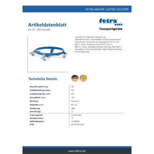 Fassroller für stehenden Transport von Stahlblech-Fässern. Geschweißte Flachstahl-Konstruktion, Kreuzstreben nach unten durchgekröpft Ø 420 mm für 60-Ltr.-Fässer, Außenring Innen-Ø 610 mm für 200-Ltr.-Fässer. Pulverbeschichtet brillantblau RAL 5007. 4 Lenkrollen, 2 Stück mit Feststeller, Räder Polyamid, Naben mit Gleitlagerung.