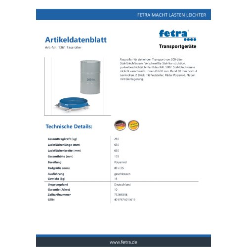 Fassroller für stehenden Transport von 200-Liter Stahlblechfässern. Verschweißte Stahlkonstruktion, pulverbeschichtet brillantblau RAL 5007. Stahlblechwanne öldicht verschweißt. Innen-Ø 630 mm. Rand 80 mm hoch. 4 Lenkrollen, 2 Stück mit Feststeller, Räder Polyamid, Naben mit Gleitlagerung.
