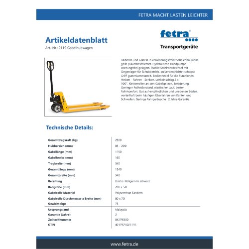 Eigenschaften "FETRA Gabelhubwagen 2119 - 2.5 to., Gabellänge 1150mm"