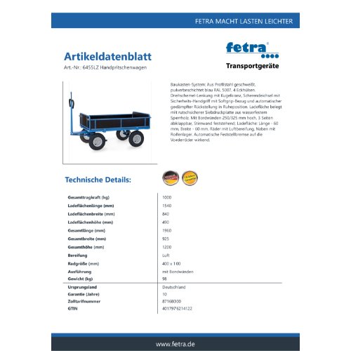 Eigenschaften "FETRA Handpritschenwagen 6455LZ mit Zugöse"