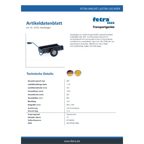 Eigenschaften "FETRA Handwagen mit Kasten 4109L -Lufträder Ø400 mm"