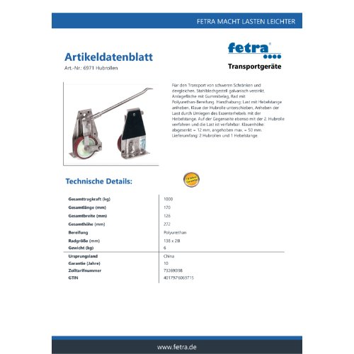 Für den Transport von schweren Schränken und dergleichen, Stahlblechgestell galvanisch verzinkt, Anlagefläche mit Gummibelag, Rad mit Polyurethan-Bereifung. Handhabung: Last mit Hebelstange anheben, Klaue der Hubrolle unterschieben, Anheben der Last durch Umlegen des Exzenterhebels mit der Hebelstange. Auf der Gegenseite ebenso mit der 2. Hubrolle verfahren und die Last ist verfahrbar. Klauenhöhe: abgesenkt = 12 mm, angehoben max. = 50 mm. Lieferumfang: 2 Hubrollen und 1 Hebelstange.
