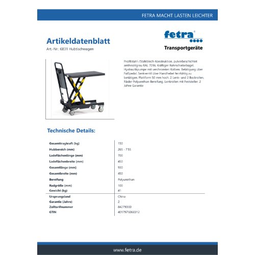 Eigenschaften "FETRA Hubtischwagen 6831"