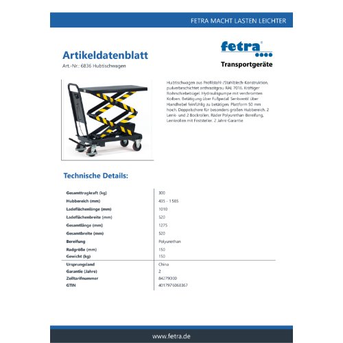 Eigenschaften "FETRA Hubtischwagen 6836"