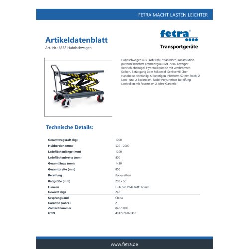 Eigenschaften "FETRA Hubtischwagen 6838"
