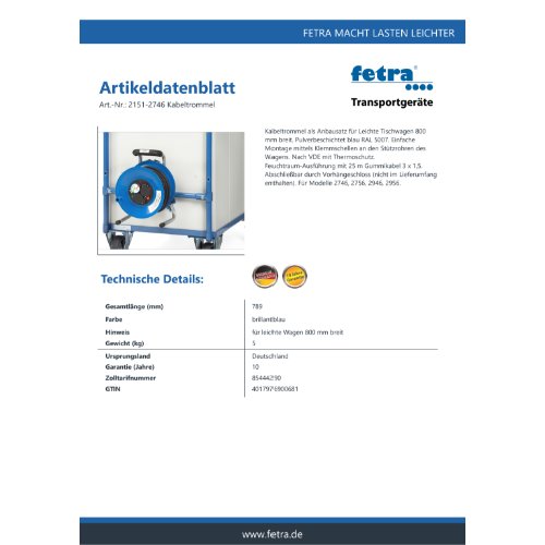 Eigenschaften "FETRA Kabeltrommel - Zubehör -, 2151-2746"