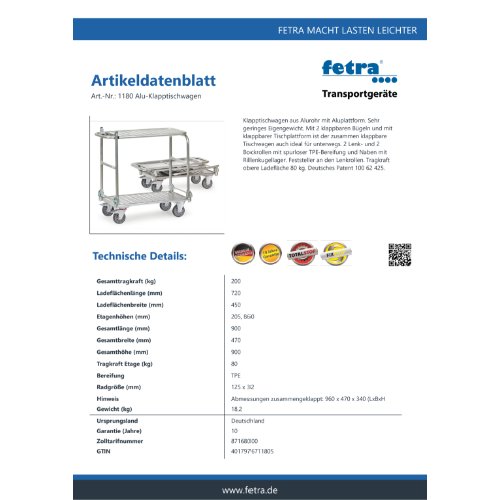 Eigenschaften "FETRA Klapp-Tischwagen 1180 -ALU-"