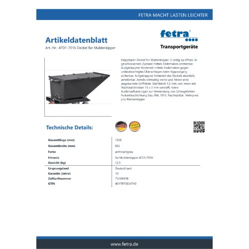 | Variante: | FETRA Klappbarer Deckel 2-seitig öffenbar, 47D1-7016 |