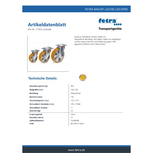 Eigenschaften "FETRA Lenkrolle 160 x 50 mm, 71303"