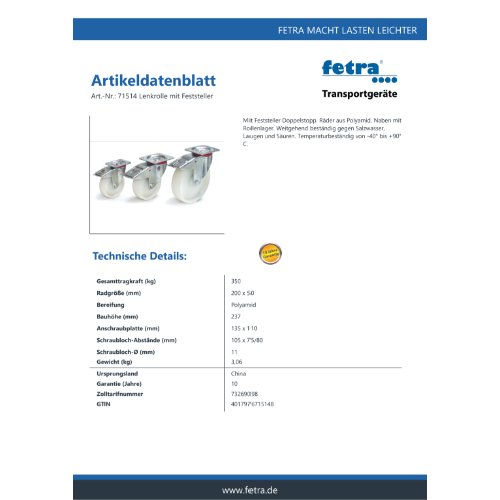 Eigenschaften "FETRA Lenkrolle mit Feststeller 200 x 50 mm, 71514"