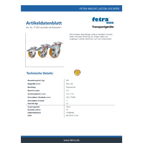 Eigenschaften "FETRA Lenkrolle mit Feststeller 200 x 50 mm, 71314"