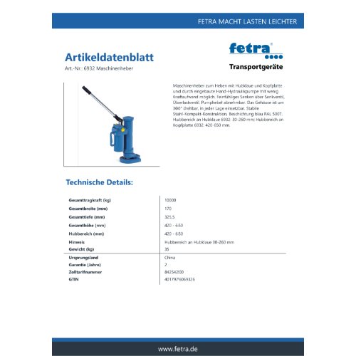Maschinenheber zum Heben mit Hubklaue und Kopfplatte und durch eingebaute Hand-Hydraulikpumpe mit wenig Kraftaufwand möglich. Feinfühliges Senken über Senkventil, Überlastventil. Pumphebel abnehmbar. Das Gehäuse ist um 360° drehbar, in jeder Lage einsetzbar. Stabile Stahl-Kompakt-Konstruktion, Beschichtung blau RAL 5007. Hubbereich an Hubklaue 6932: 30-260 mm; Hubbereich an Kopfplatte 6932: 420-650 mm.