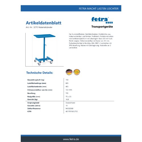Für Kunststoffkästen, Stahlblechkästen, Drahtkörbe usw., höhenverstellbar und fahrbar. Profilstahl-/Rohrkonstruktion mit Stahlblechplattform mit allseitigem Rand 20 mm hoch. Nicht neigbar. Höhenverstellbar im Raster von 25 mm. Pulverbeschichtet brillantblau RAL 5007. 4 Lenkrollen mit TPE-Bereifung, Naben mit Gleitlagerung. Feststeller an 2 Lenkrollen.