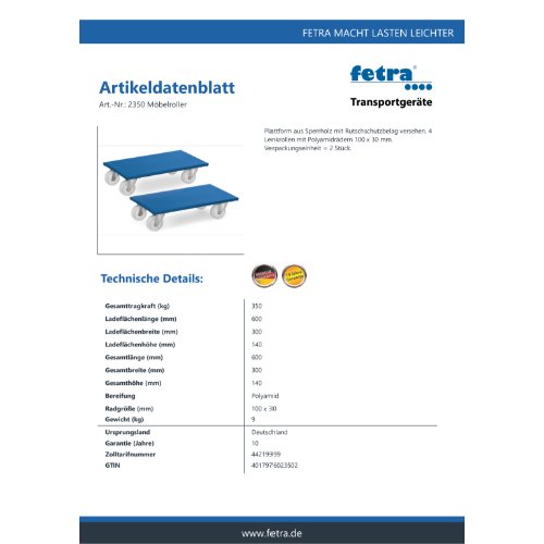 Plattform aus Sperrholz mit Rutschschutzbelag versehen. 4 Lenkrollen mit Polyamidrädern 100 x 30 mm. Verpackungseinheit = 2 Stück.