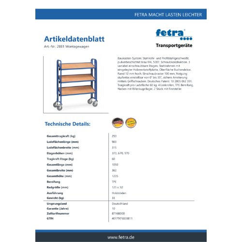 Baukasten-System: Stahlrohr- und Profilstahlgeschweißt, pulverbeschichtet blau RAL 5007, Schraubkonstruktion. 3 variabel einschraubbare Etagen, Stahlrahmen mit eingelegter Holzwerkstoffplatte, Oberfläche Buchendekor, Rand 12 mm hoch. Einschraubraster 100 mm, Neigung stufenlos einstellbar von 0° bis 35°, sichere Arretierung mittels Griffschrauben. Deutsches Patent: 10 2005 062 391. Tragkraft pro Ladefläche 60 kg. 4 Lenkrollen, TPE-Bereifung, Naben mit Rillenkugellager. 2 Stück mit Feststeller.