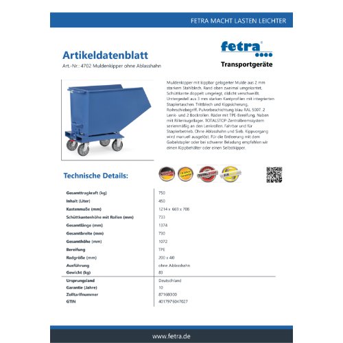 Muldenkipper mit kippbar gelagerter Mulde aus 2 mm starkem Stahlblech, Rand oben zweimal umgekantet, Schüttkante doppelt umgelegt, öldicht verschweißt. Untergestell aus 3 mm starken Kantprofilen mit integrierten Staplertaschen. Trittblech und Kippsicherung, Rohrschiebegriff. Pulverbeschichtung blau RAL 5007. 2 Lenk- und 2 Bockrollen. Räder mit TPE-Bereifung, Naben mit Rillenkugellager. TOTALSTOP-Zentralbremssystem serienmäßig an den Lenkrollen. Fahrbar und für Staplerbetrieb. Ohne Ablasshahn und Sieb. Kippvorgang wird manuell ausgelöst. Für die Entleerung mit dem Gabelstapler oder bei schwerer Beladung empfehlen wir einen Kippbehälter oder einen Selbstkipper.