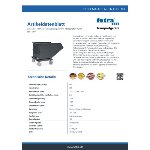 Eigenschaften "FETRA Muldenkipper 4704A-7016 mit ABLASSHAHN"