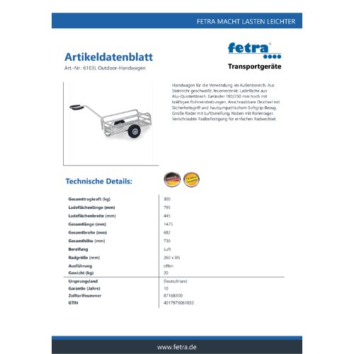 Eigenschaften "FETRA Outdoor-Handwagen 6103L - Lufträder Ø260 mm"