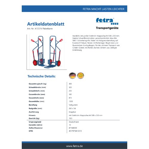 Handlich, mit großer Stahlrohr-Klappschaufel 500 x 250 mm. Stabile Schweißkonstruktion, pulverbeschichtet, blau RAL 5007. Sicherheitsgriffe. Räder mit Vollgummibereifung auf Kunststoff-Felgen. Naben mit Rollenlager. Bügel oben und Querstreben durchgebogen. Für den sicheren Transport von runden Gütern, wie Rollen, Kannen, Eimern usw. Zerlegte Anlieferung.