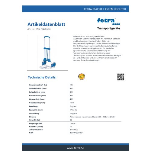 Paketroller aus erstklassig verarbeiteter Aluminium-Stahlrohrkonstruktion mit Aluminium-Schaufel und hochwertigen Kunststoffteilen. Räder mit Polymerbereifung blaugrau spurlos, Naben mit Rollenlager. Der Griffbügel aus handsympathischem rutschsicherem Material rundet diese Klappkarre ab. Ein elastisches Spannband und Spannleiste zur Sicherung des Transportgutes ermöglichen die Fixierung des Transportguts. Schaufel und Räder sind mit einem Handgriff an- und abklappbar und der Griffholm einschiebbar. In wenigen Sekunden einsatzbereit.