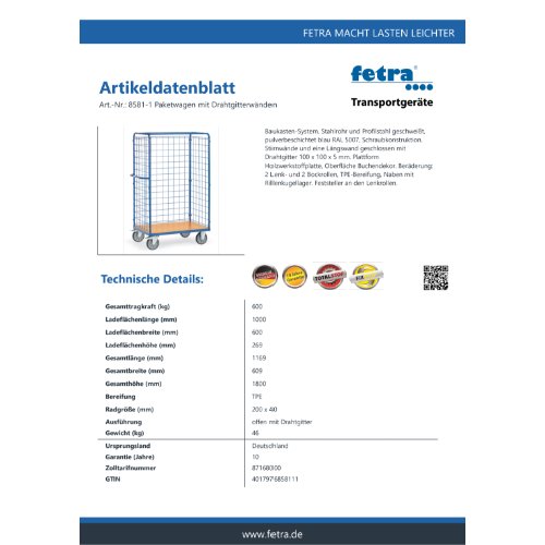 Eigenschaften "FETRA Paketwagen 8581-1"