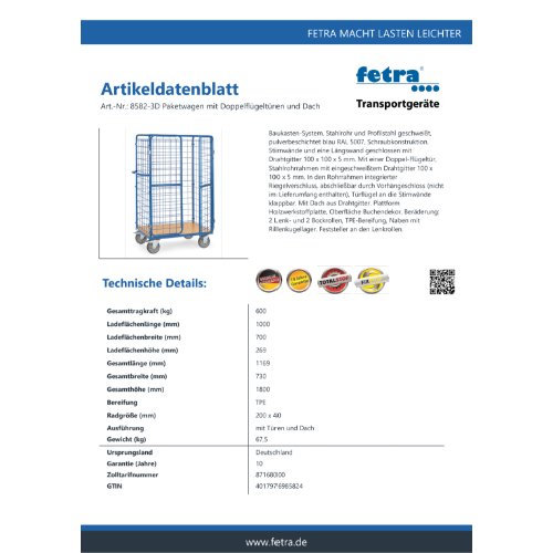 Eigenschaften "FETRA Paketwagen 8582-3D mit Dach"