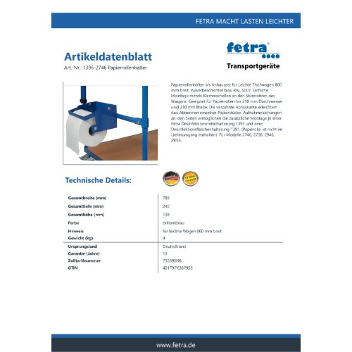 Eigenschaften "FETRA Papierrollenhalter - Zubehör -, 1396-2746"