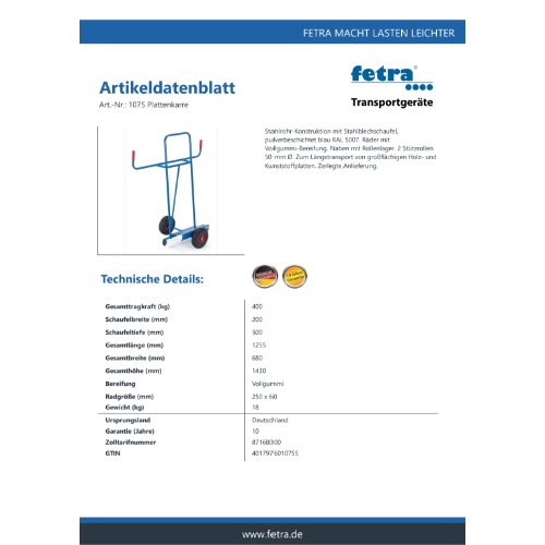 Stahlrohr-Konstruktion mit Stahlblechschaufel, pulverbeschichtet blau RAL 5007. Räder mit Vollgummi-Bereifung. Naben mit Rollenlager. 2 Stützrollen 50 mm Ø. Zum Längstransport von großflächigen Holz- und Kunststoffplatten. Zerlegte Anlieferung.