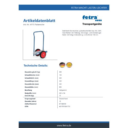 Eigenschaften "FETRA Plattenroller 4175 - Vollgummiräder Ø260 mm"