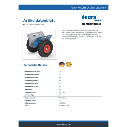 | Variante: | FETRA Plattenroller 4158 - Lufträder Ø260 mm |