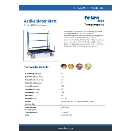 Eigenschaften "FETRA Plattenwagen 4433 - Ladefläche mit Riefengummi"