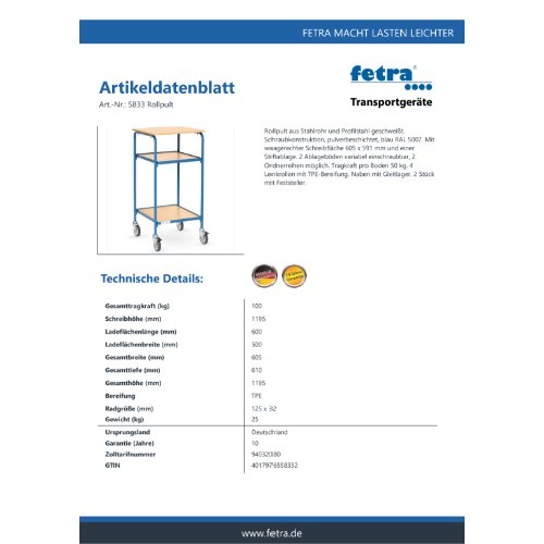 Rollpult aus Stahlrohr und Profilstahl geschweißt, Schraubkonstruktion, pulverbeschichtet, blau RAL 5007. Mit waagerechter Schreibfläche 605 x 591 mm und einer Stiftablage. 2 Ablageböden variabel einschraubbar, 2 Ordnerreihen möglich. Tragkraft pro Boden 50 kg. 4 Lenkrollen mit TPE-Bereifung, Naben mit Gleitlager. 2 Stück mit Feststeller.