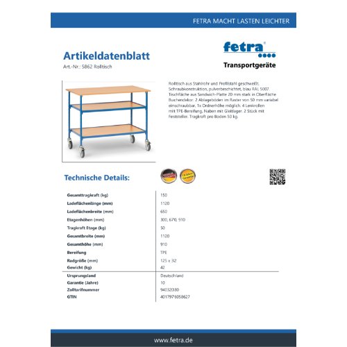 Rolltisch aus Stahlrohr und Profilstahl geschweißt, Schraubkonstruktion, pulverbeschichtet, blau RAL 5007. Tischfläche aus Sandwich-Platte 20 mm stark in Oberfläche Buchendekor. 2 Ablageböden im Raster von 50 mm variabel einschraubbar. 1x Ordnerhöhe möglich. 4 Lenkrollen mit TPE-Bereifung, Naben mit Gleitlager. 2 Stück mit Feststeller. Tragkraft pro Boden 50 kg.