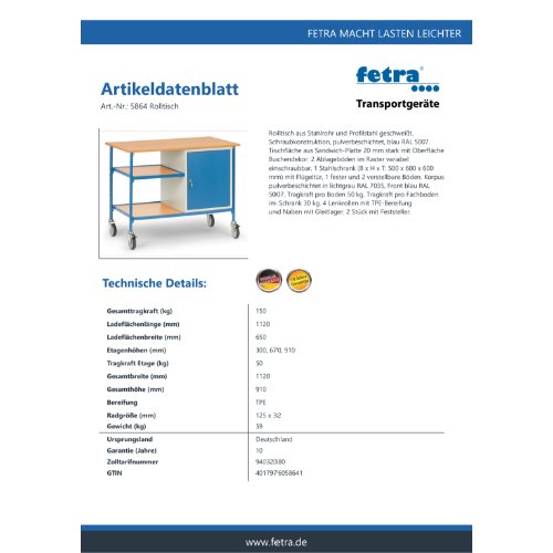 Rolltisch aus Stahlrohr und Profilstahl geschweißt, Schraubkonstruktion, pulverbeschichtet, blau RAL 5007. Tischfläche aus Sandwich-Platte 20 mm stark mit Oberfläche Buchendekor. 2 Ablageböden im Raster variabel einschraubbar. 1 Stahlschrank (B x H x T: 500 x 600 x 600 mm) mit Flügeltür, 1 fester und 2 verstellbare Böden. Korpus pulverbeschichtet in lichtgrau RAL 7035, Front blau RAL 5007. Tragkraft pro Boden 50 kg. Tragkraft pro Fachboden im Schrank 30 kg. 4 Lenkrollen mit TPE-Bereifung und Naben mit Gleitlager. 2 Stück mit Feststeller.